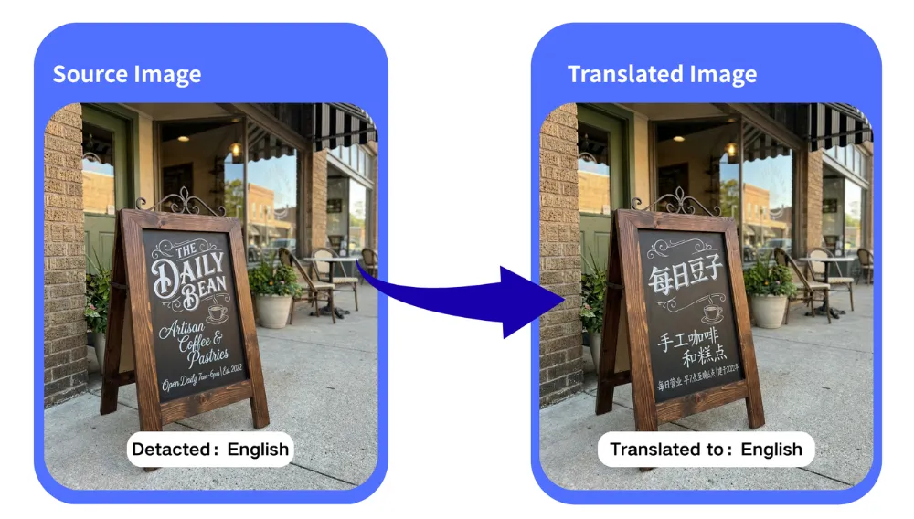 AI intelligently detects all text in images, including photos, screenshots, infographics, handwritten text, and complex layouts, ensuring accurate translations