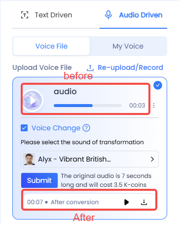 Creation Platform > My Voice > Select Voice > Click "Voice Change" > Choose Voice > Submit for Transformation