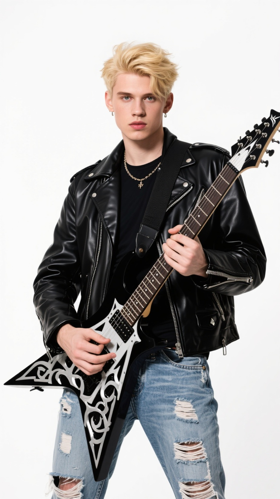 Replace a female lead singer with a male singer from a reference image, fully replicating movements for a continuous, uncut shot with synchronized band performance.