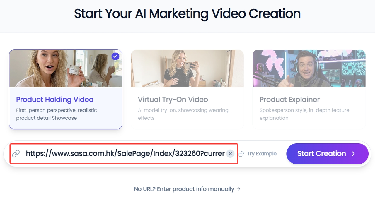 Open the KreadoAI marketing video generation tool, select the appropriate video type (Product Holding, Virtual Try-On, or Product Explainer), and paste your product page URL. If no URL is available, you can also manually enter the product information.