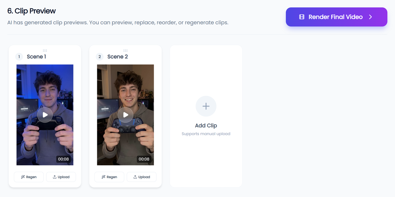 ✅ Preview and Refine Multiple Versions: Replace materials, adjust sequences, or regenerate clips until satisfied.