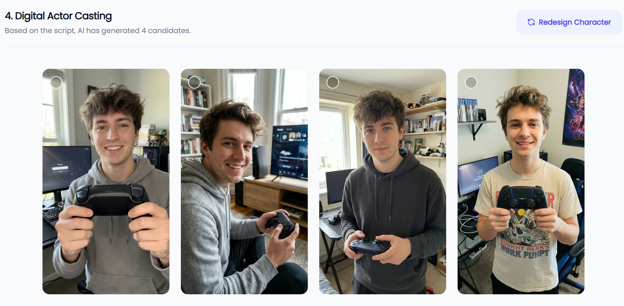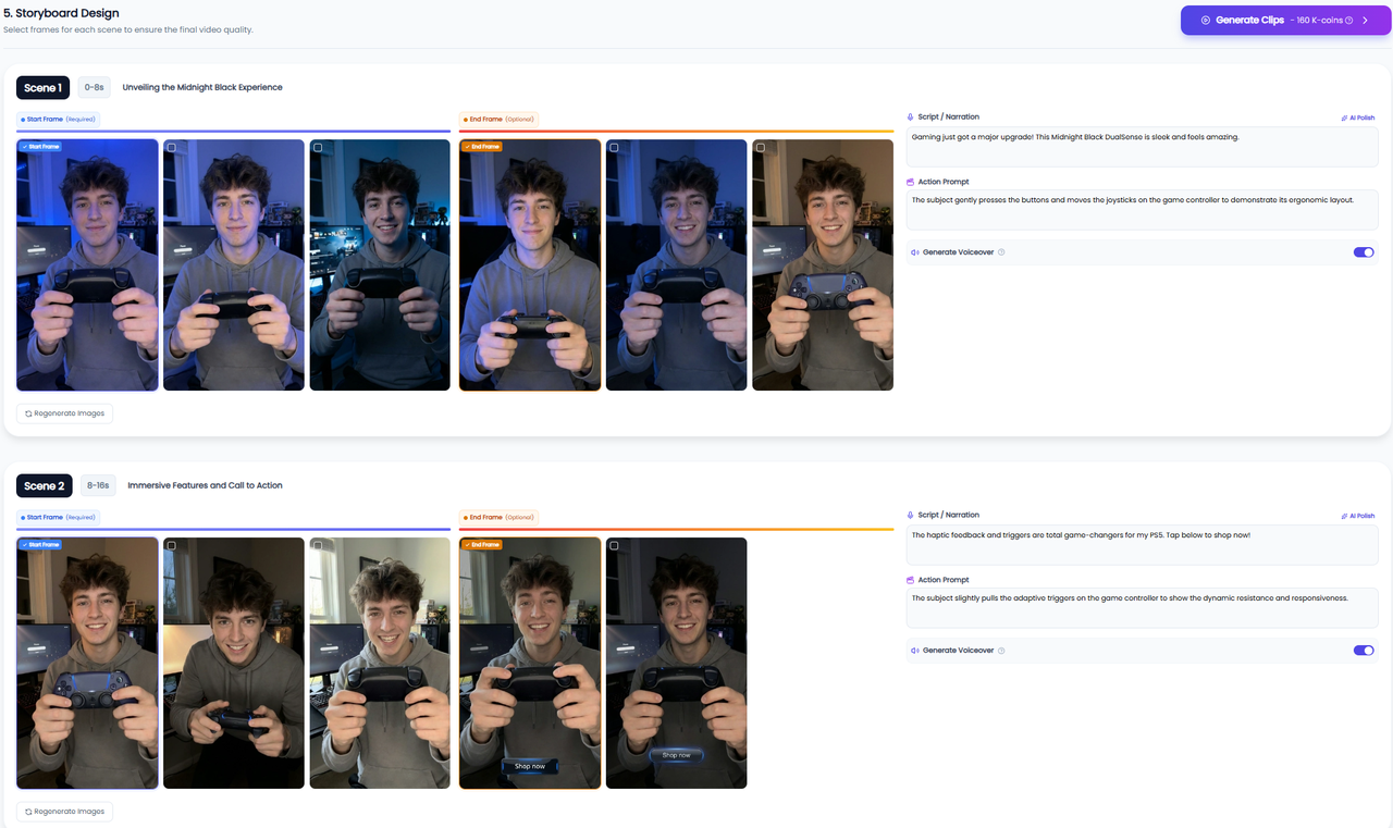 The system will suggest several AI avatars. Choose the one that best fits your brand. It will generate a storyboard, allowing you to edit opening and ending frames, voiceover scripts, or action prompts. Once generated, preview the video online, adjust materials or sequence, and regenerate any unsatisfactory clips. When satisfied, click Render Final Video to preview, download, or share.
