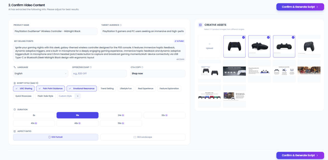 Preview and confirm the product materials collected by the system. You can add or edit product copy and images based on your marketing needs. Then set key parameters, including video duration, output ratio (16:9 for websites or ads, 9:16 for short video platforms), target language, script style, and other relevant settings.