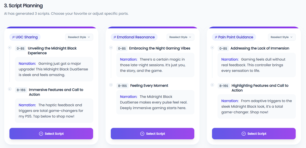 The system will generate three AI voiceover scripts tailored to this video type. You can choose one or customize it to better match your brand tone.