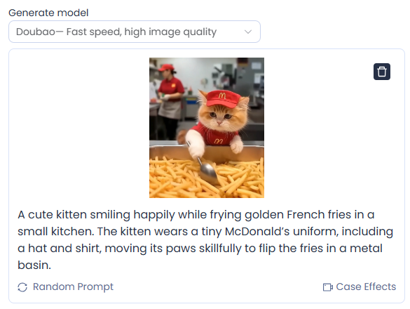 Now the creative part: describe exactly what you want your pet to do. Include actions, scene, mood, and expression. For example: “My cat wearing a party hat, spinning around and batting at a floating balloon” or “My dog in a chef hat, carefully stirring a bowl in the kitchen.” The more precise your description, the more realistic and entertaining the video.