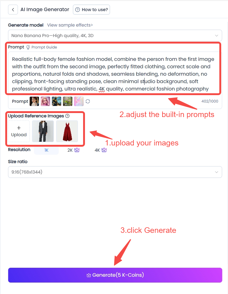 Step 2: Adjust with Prompts – Use built-in smart prompts to easily tweak clothing style, change clothes color, fabric, and other details.
