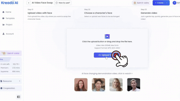 - Upload Your Video: Select a video featuring a character’s face and upload it to the KreadoAI platform.