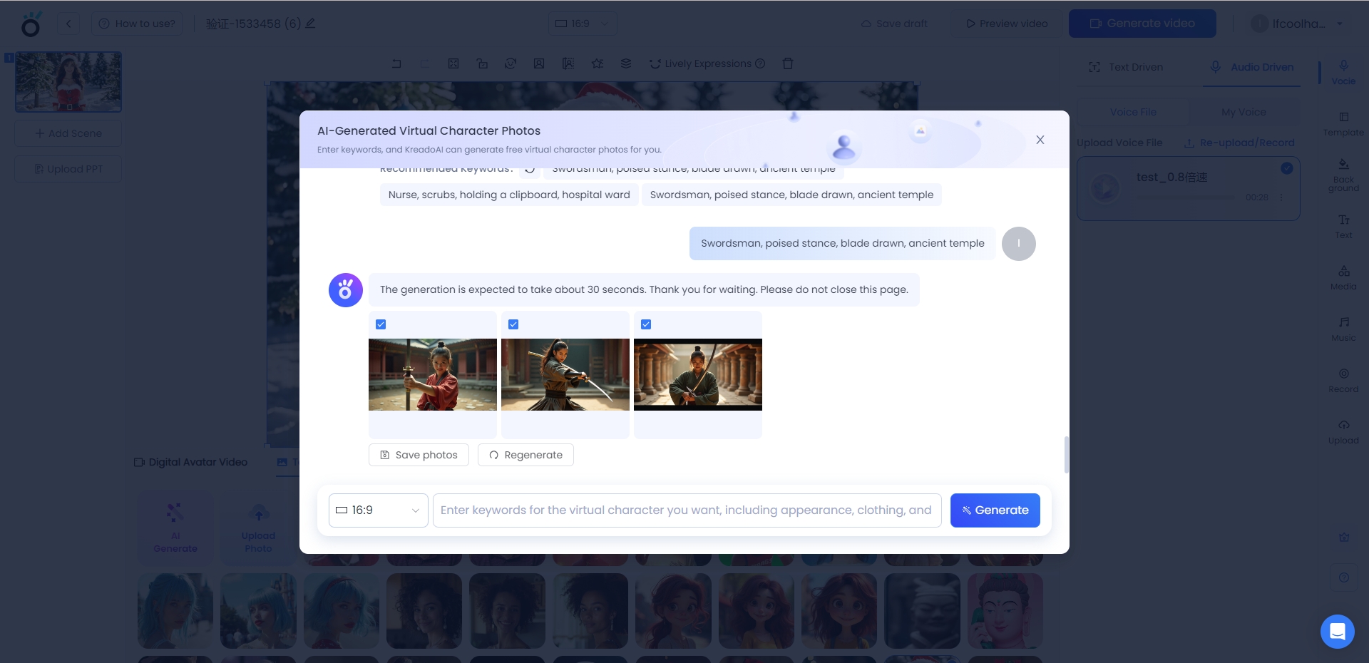 Click “AI Generate Photo” to create a virtual character. Customize the text or use AI-generated prompts, then click “Generate Now” to produce the photo. Save the image to your library or click “Regenerate” for more options.