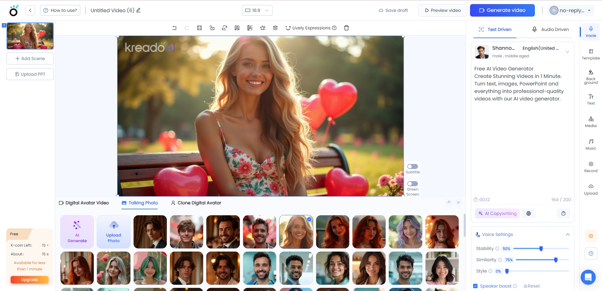 Select your chosen photo to begin the photo digital human video creation process. KreadoAI’s intuitive interface will guide you through the next steps, including voice selection, language customization, and more.