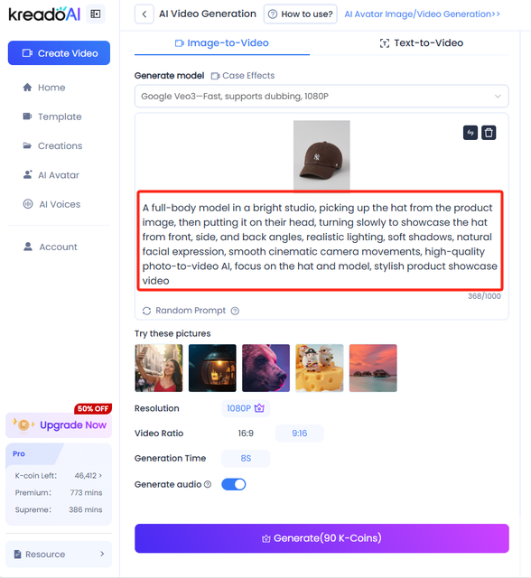 Select your product image and describe the animation you want in the prompt. You can specify camera movements, spins, zooms, effects, or even background music. This gives the AI clear instructions to turn your static photo into a dynamic video. Whether you’re trying a free AI image to video tool or a full-featured platform, the prompt ensures your video matches your vision.