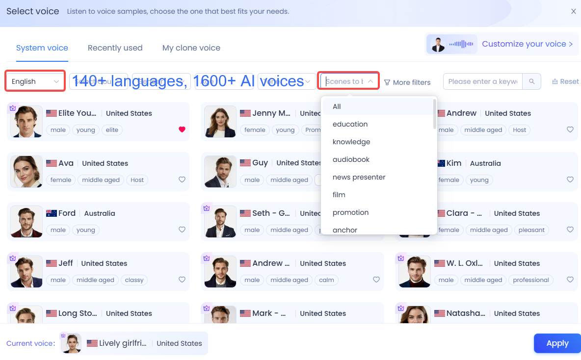 Log into KreadoAI and explore the vast library of 1,600+ voices. You can filter by language, gender, tone, and style to find the perfect match for your character.
