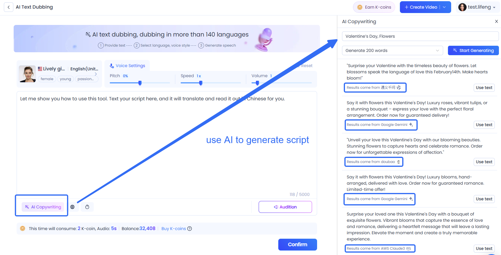 Writing engaging dialogue and in-game narration is a crucial but time-intensive task. KreadoAI simplifies this process with built-in AI script generation. By entering a few keywords or descriptions, you can instantly generate compelling character dialogues, tutorials, or narration. KreadoAI’s AI tools are powered by Gemini, Claude 3 (for global users), and Microsoft, Kimi, ensuring high-quality scriptwriting tailored to different markets.