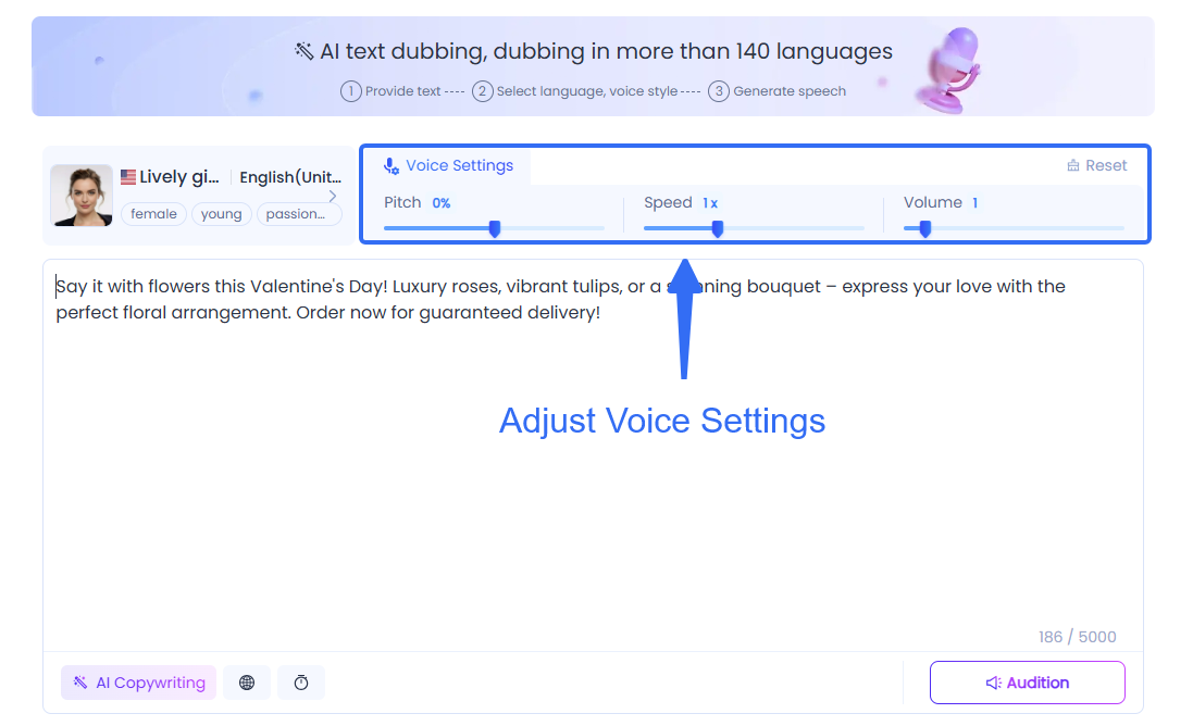 Fine-tune your selected voice by adjusting parameters like speed, pitch, and emotion to fit your character’s personality.