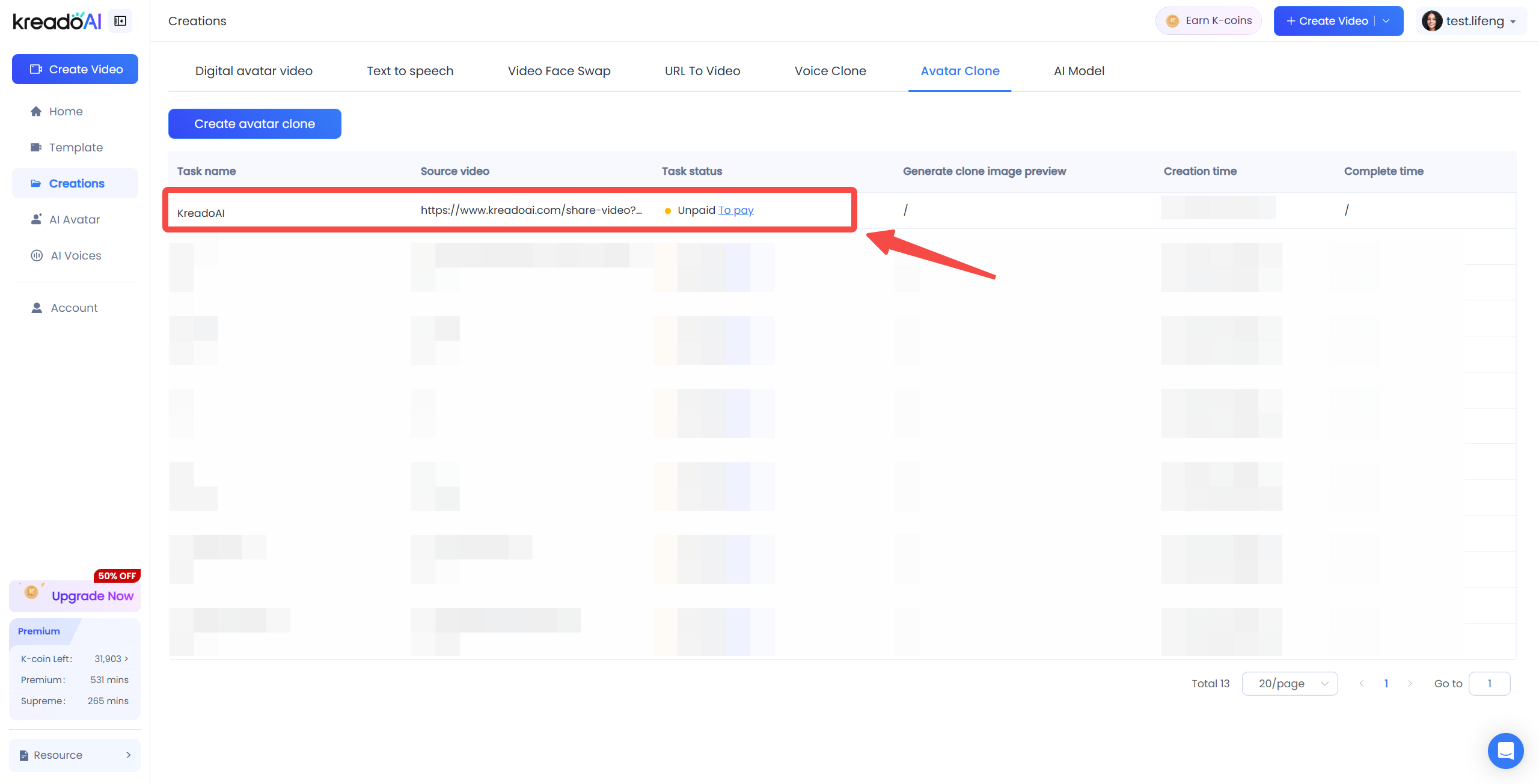 View the cloning progress in "My Projects." You can also contact your dedicated support at support@kreadoai.com for more cloning details.