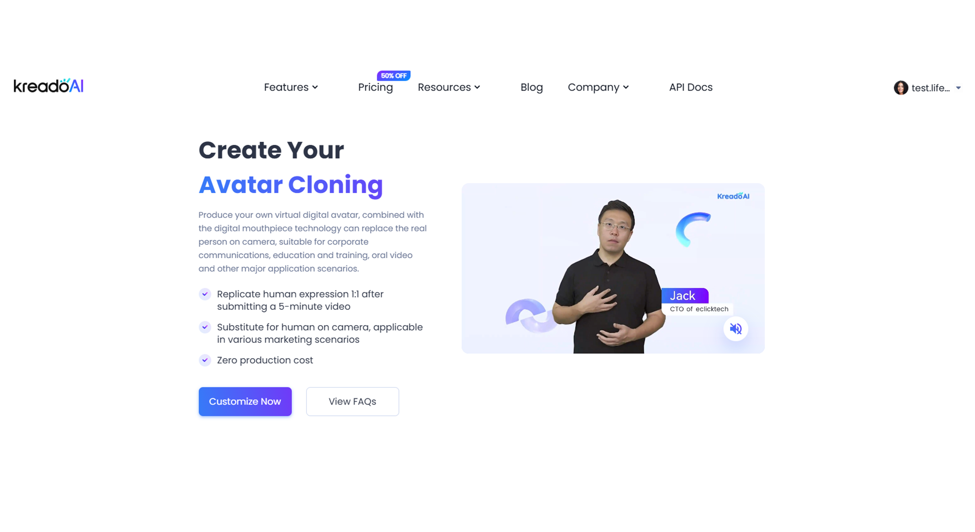 Simply upload a 5-minutes recorded video, and KreadoAI will instantly recreate your appearance with a 1:1 AI avatar clone—perfect for social media, branding, AI video creation, and more.