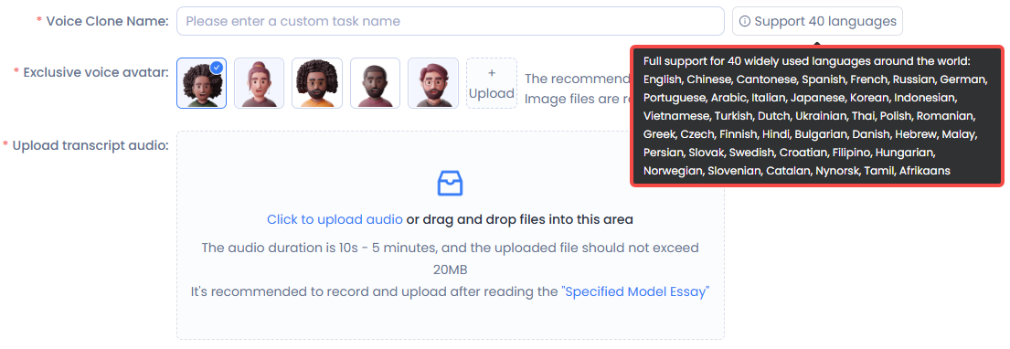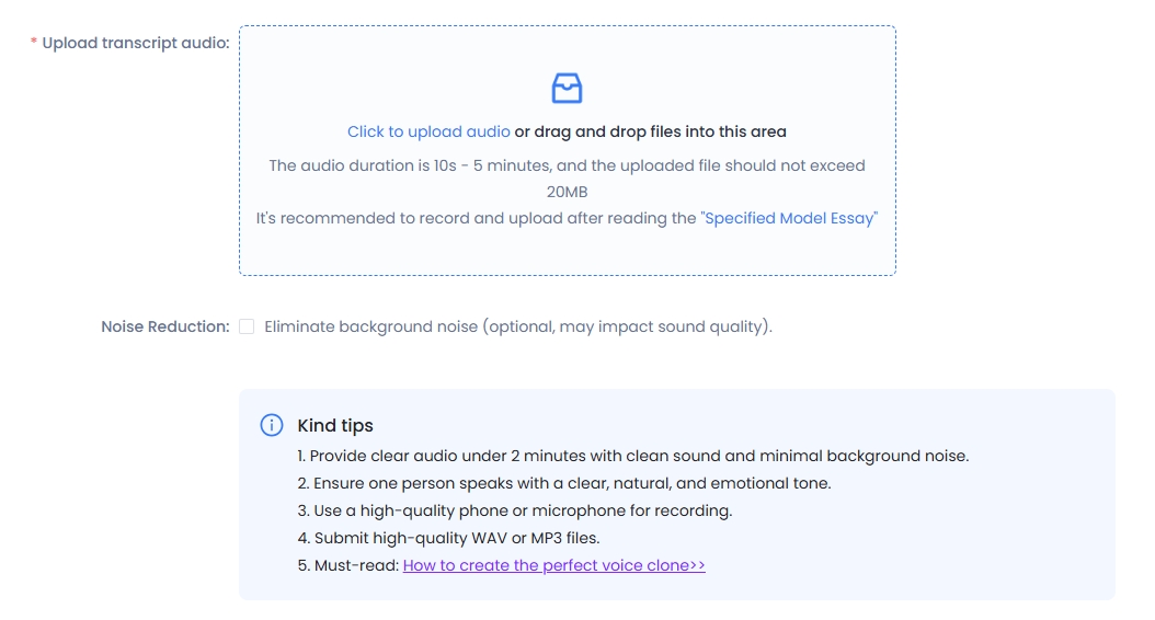 Upload transcript audio by clicking or dragging files into this area. Please ensure the audio duration is between 10s to 5 minutes, and the file size does not exceed 20MB.
