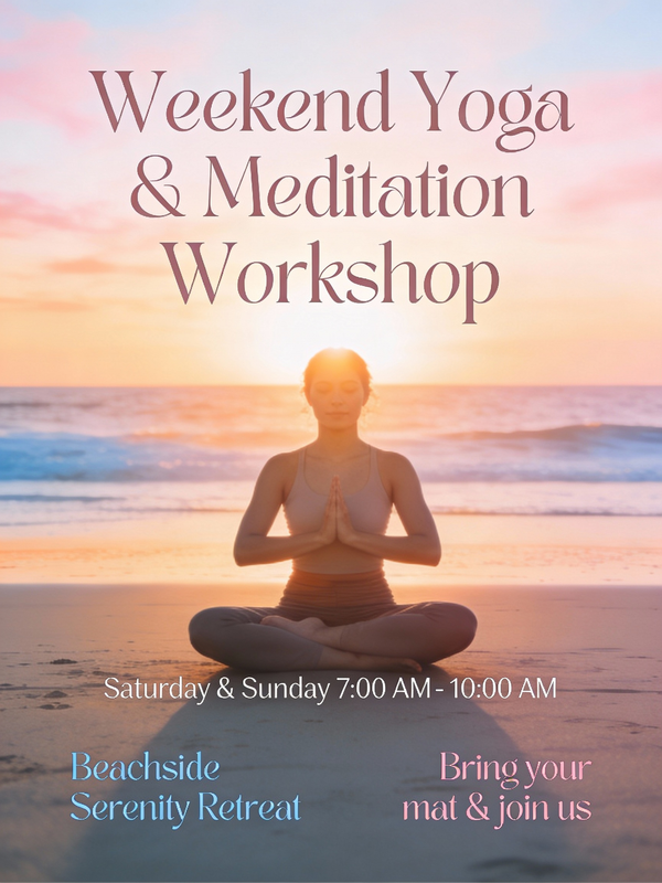 A serene and calming poster for a weekend yoga and meditation workshop. The main visual is a beautiful, soft-focus photograph of a person in a peaceful yoga pose on a beach at sunrise. The color palette is soft pastels (pinks, oranges, light blues). The typography is a gentle, flowing script. The poster should evoke feelings of peace, wellness, and self-care. –ar 3:4