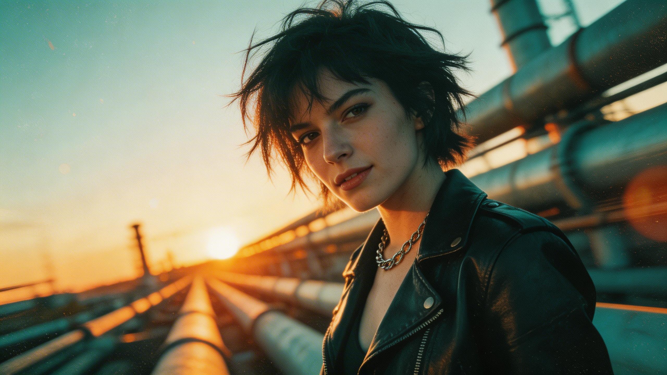 Example: Cinematic film photography, strong visual storytelling. Avant-garde female with messy short hair, rebellious expression. Urban or industrial setting with dramatic sunset light, casting silhouettes and glows. Blue-orange and black-gold contrast, HDR lighting, sharp subject with motion-blurred background, grainy film texture, shallow depth-of-field, layered lighting, tilted perspective.
