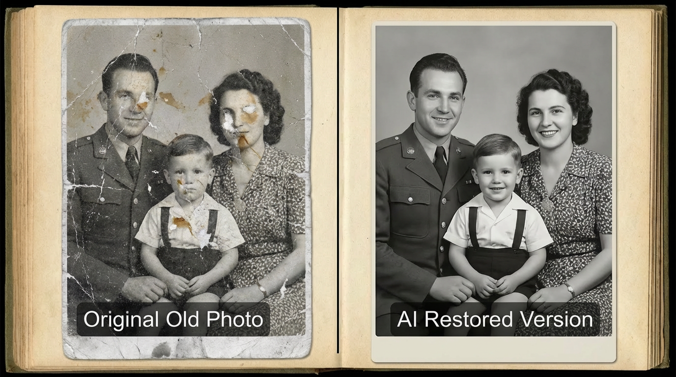 Example: Remove scratches, repair paper folds, enhance facial and clothing details. Preserve black-and-white style, adjust contrast and lighting, remove noise, achieve clear and natural result. Optional colorization: soft skin tones, natural clothing/background colors, high-fidelity restoration.
