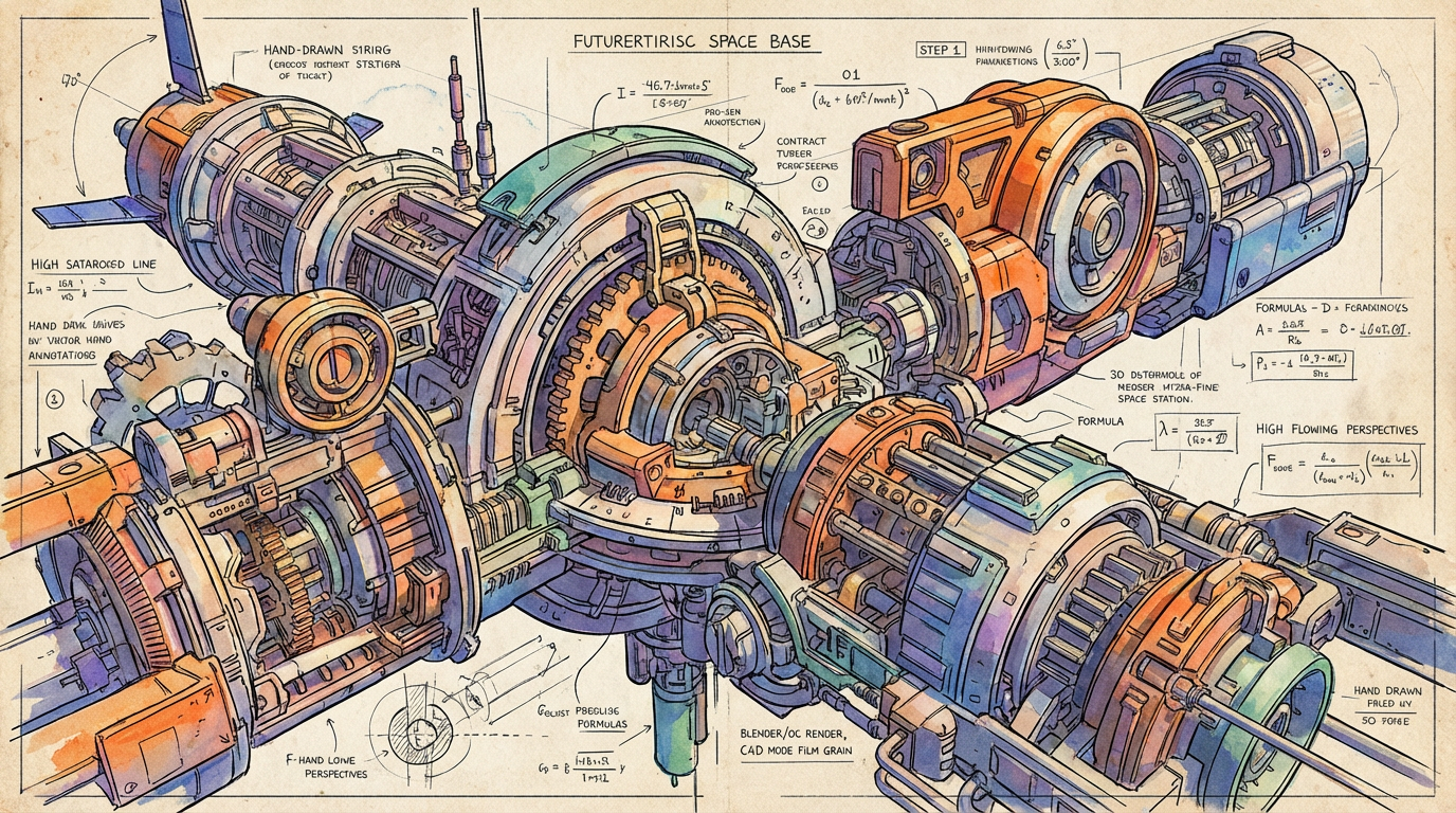 Example: Mobius-style, futuristic sci-fi, ultra-detailed. Subject: a space base with intricate hand-drawn sketches, 3D rendering of structures, design schematics, mechanical parts, and formulas. Lines dynamic and precise, strong light-dark contrast, high saturation complementary colors, perspective distortion and flow. Rendered in Blender + OC, C4D modeling, ultra-detailed CG, cinematic HD.