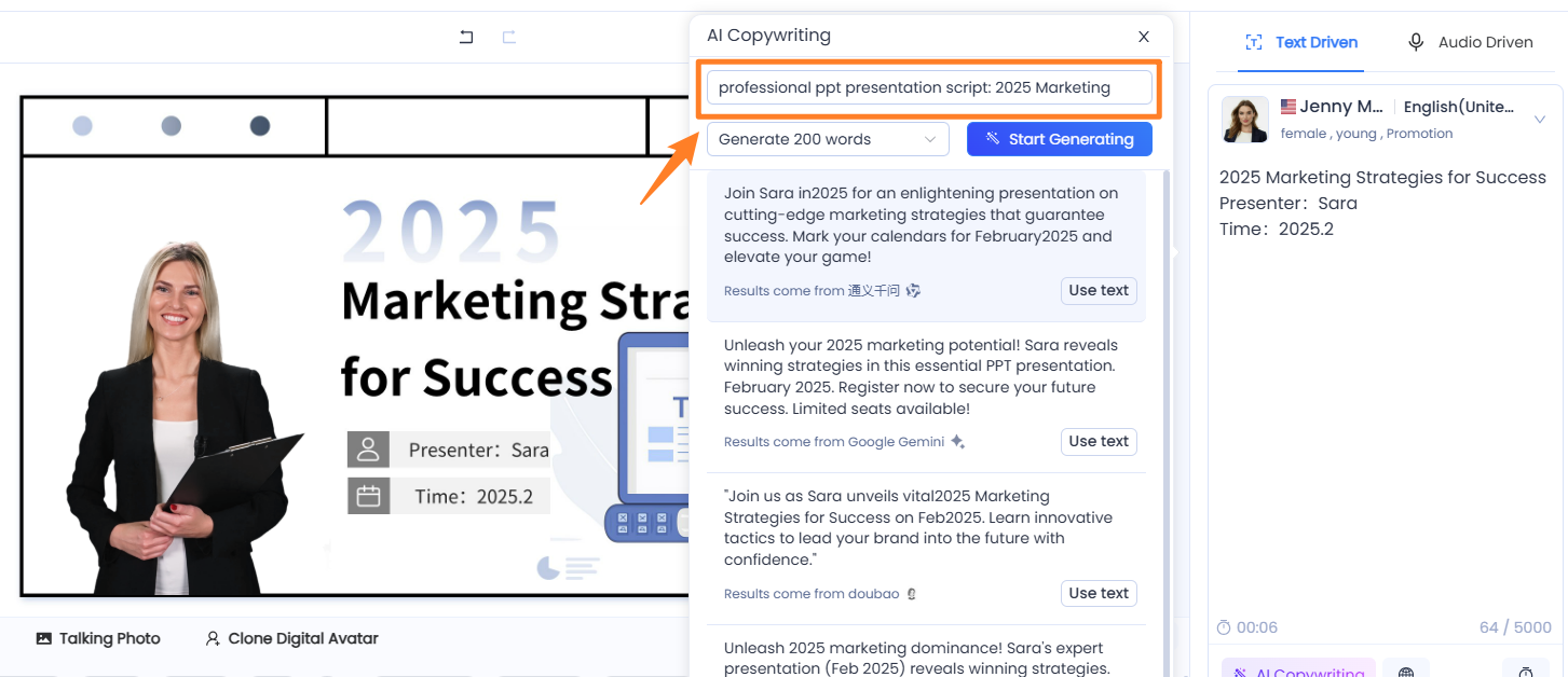 Example: Enter keywords like "2025 Marketing Strategies for Success, Presenter:Sara, Time:2025.2 " to auto-generate a professional presentation script.