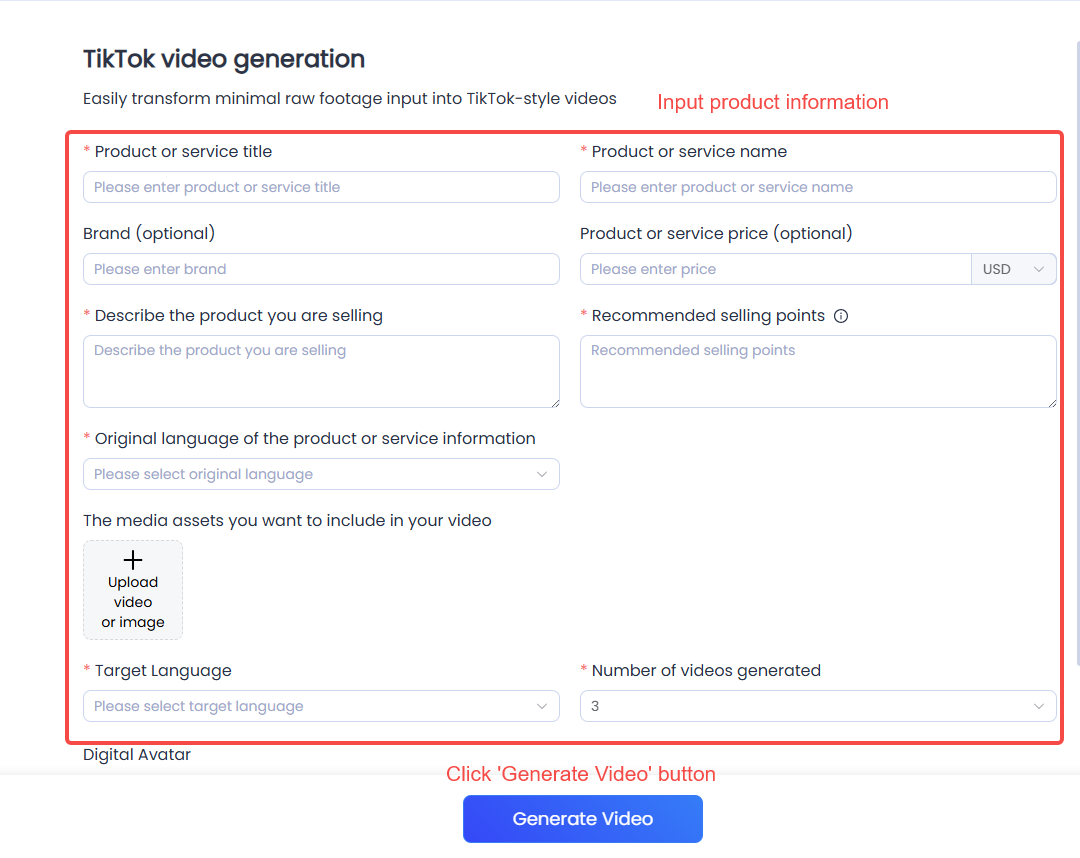Fill in your product or service name, price (optional), and a clear, concise description. The more precise your input, the better your video output.