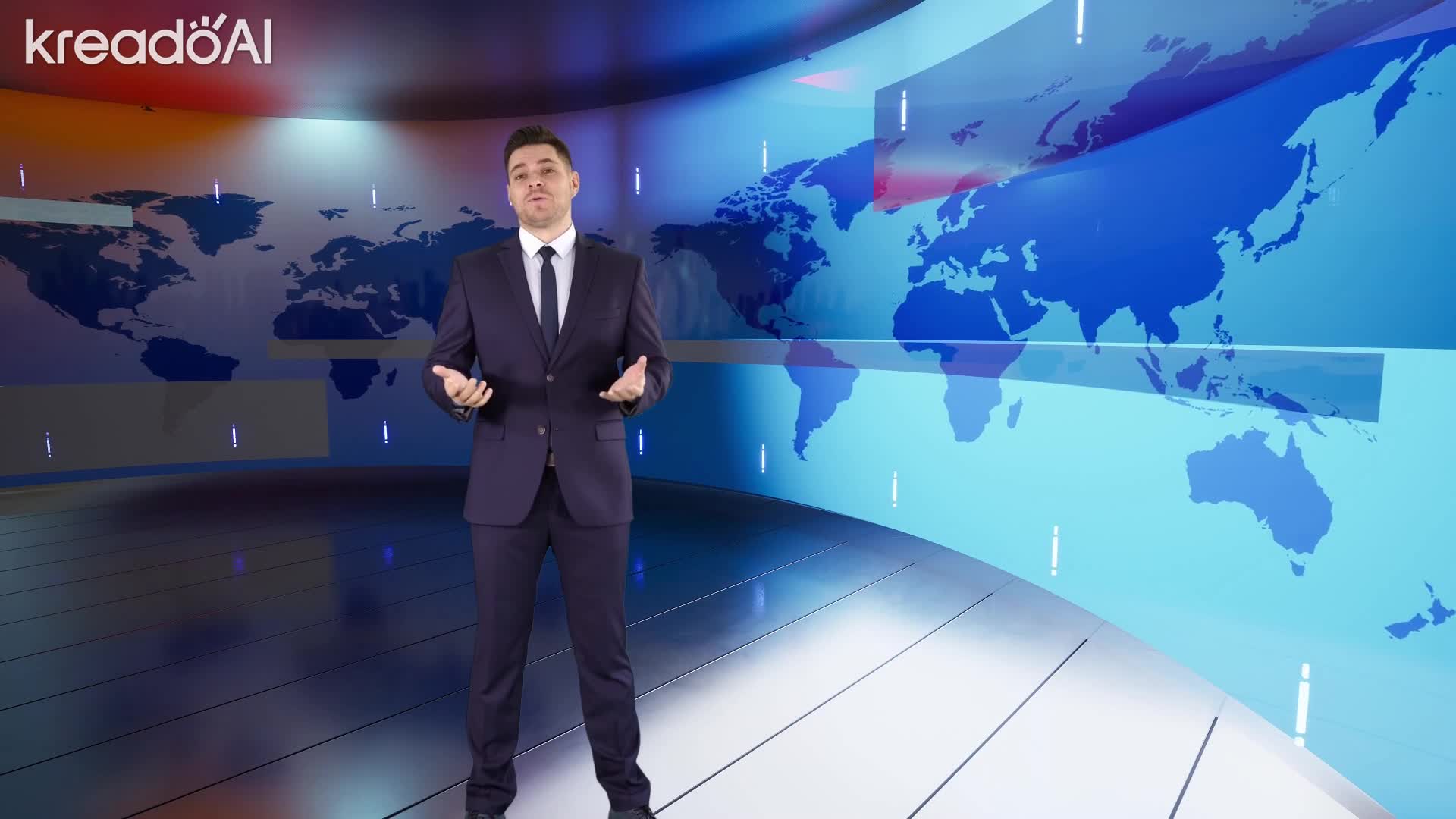 A handsome male host wearing a dark blue suit set, exuding professionalism and confidence while standing with hands crossed before the camera. Suitable for news broadcasting or educational training sessions.