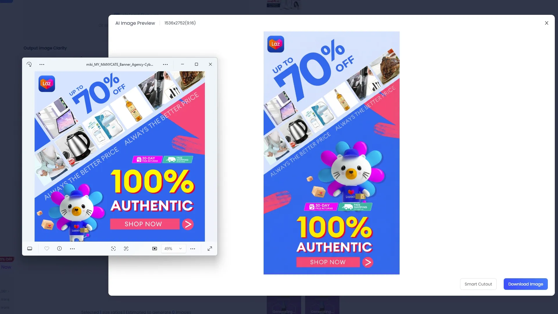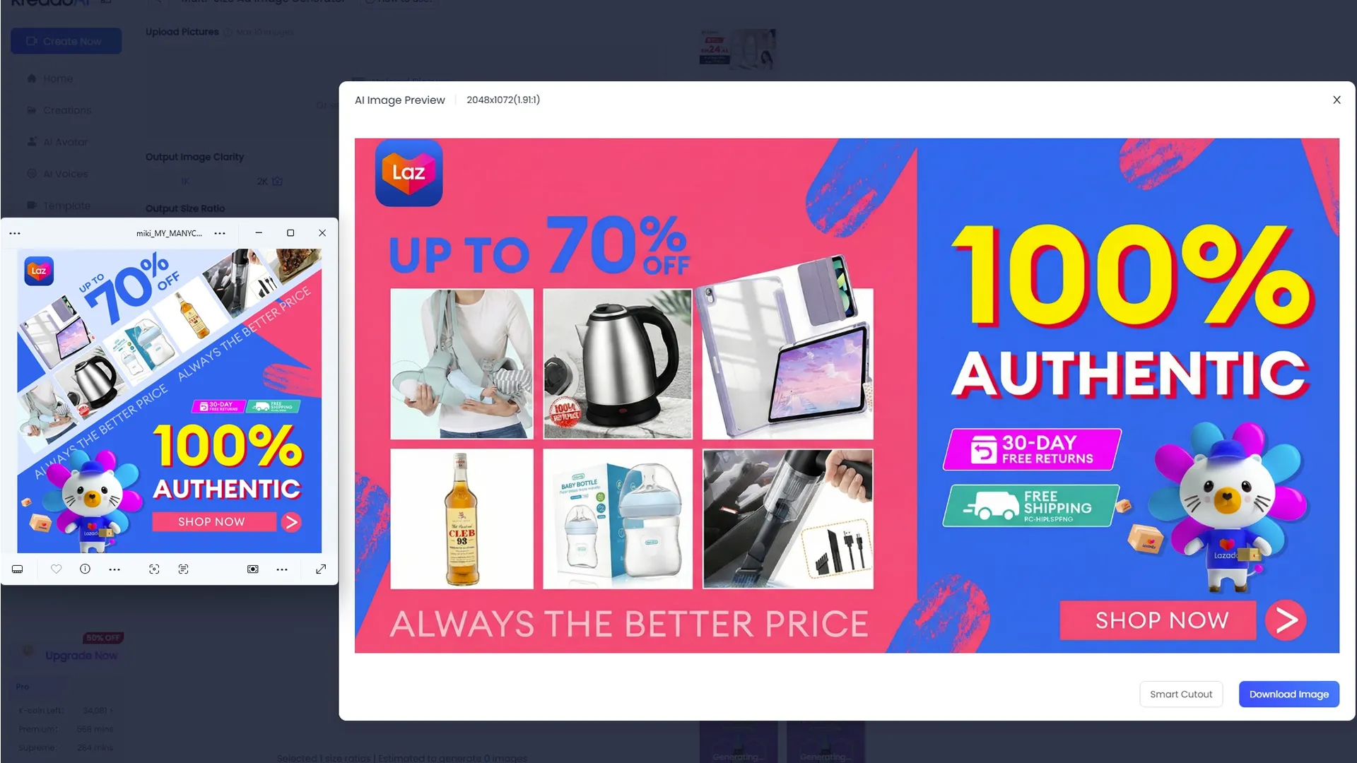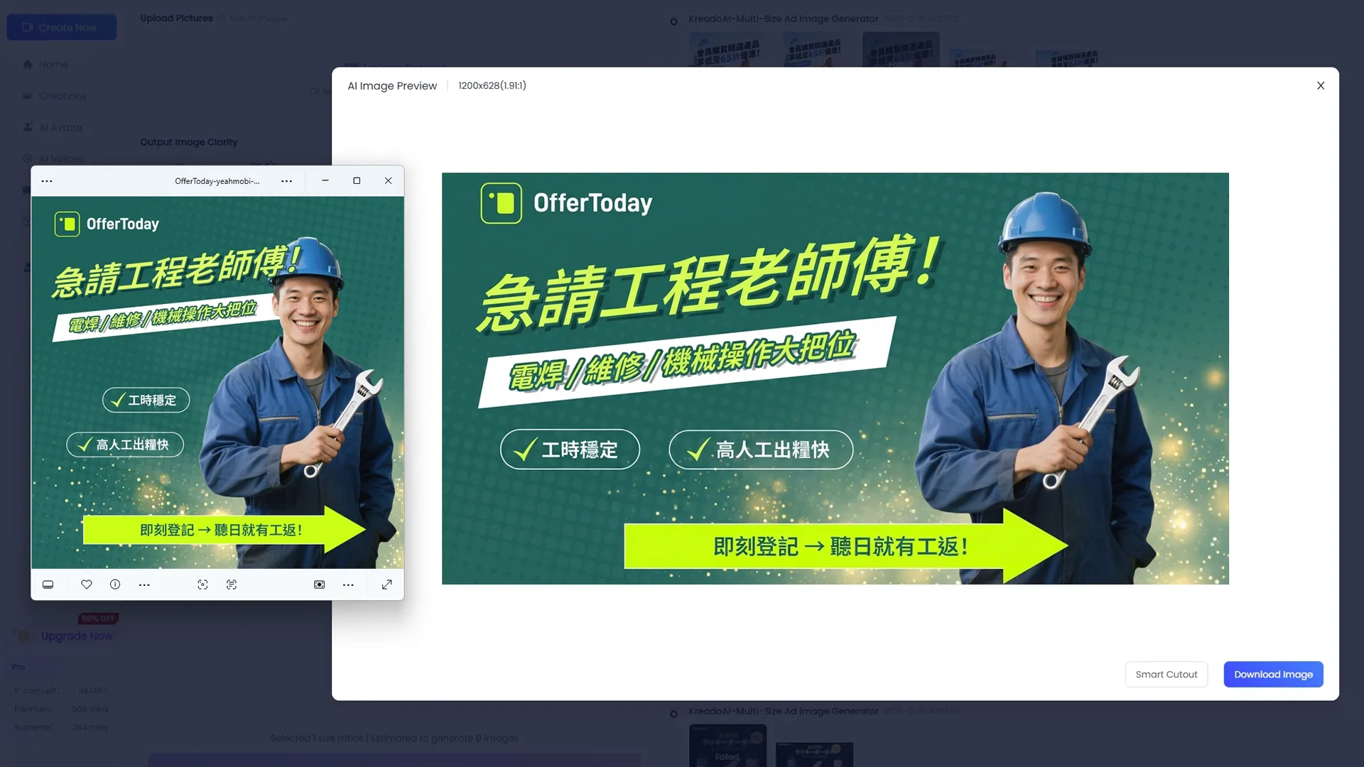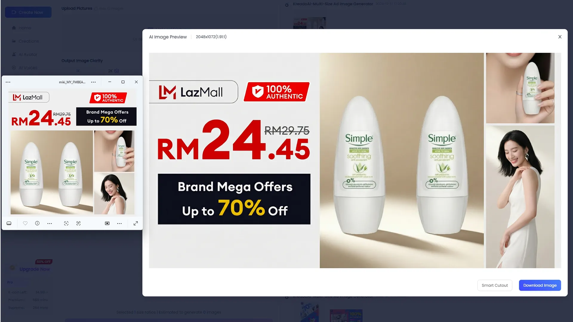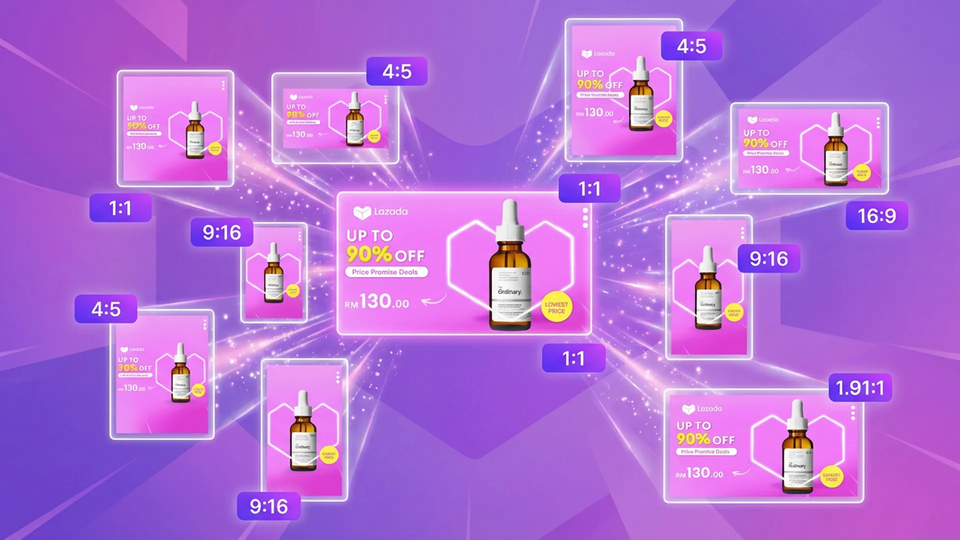 不同于传统裁剪工具,KreadoAI 通过 AI 自动调整构图,而非简单缩放,实现更自然的广告创意自动化输出