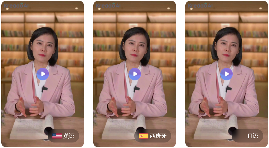 多语言支持:KreadoAI支持超过140种语言的文本输出,且无需借助第三方翻译工具。通过KreadoAI技术,EU电商可以使用同一人物IP,制作不同语言版本的视频,进一步拓宽了其在国际市场的影响力。这为其跨境电商业务提供了极大的支持,使得内容能覆盖到更广泛的观众群体,尤其是在非华语地区的传播。