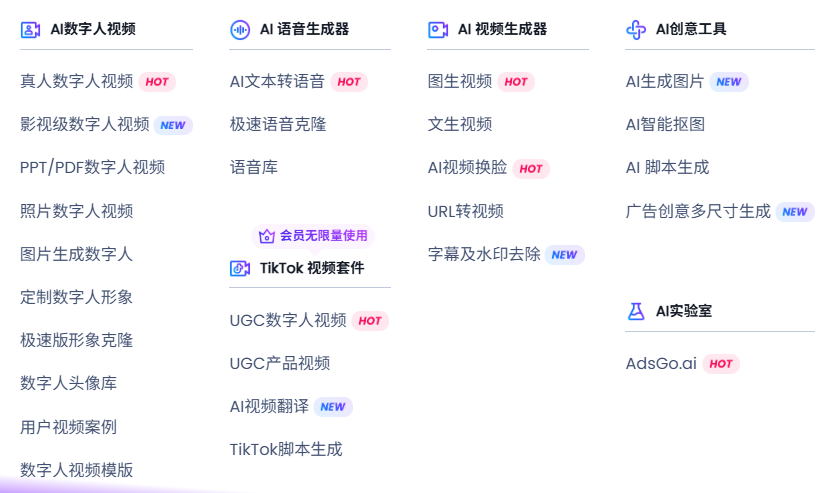 支持多种数字人视频类型:真人数字人影视级数字人PPT/PDF数字人照片数字人定制数字人形象UGC数字人