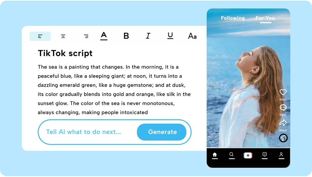AI 营销脚本生成:根据目标受众和平台特性生成优化脚本,提高观看率和用户参与度。