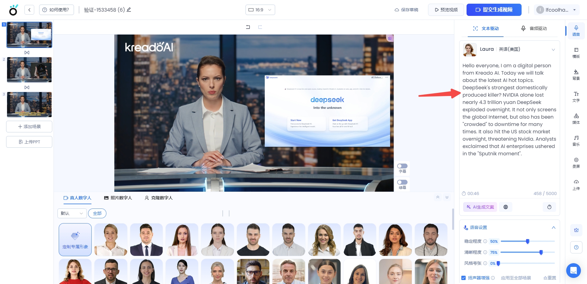 把脚本文案复制粘贴到KreadoAI,选择合适的数字人形象,输入口播内容脚本,设置好背景等元素,点击生成视频即可。KreadoAI还提供全面的视频预览功能,让您在生成前就能预见成品效果。