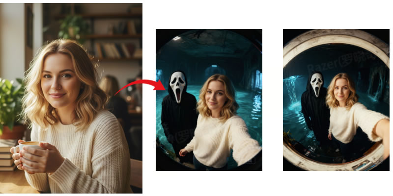 电影风格的监控画面,鱼眼镜头,画面中的人正在镜头前自拍,一个戴着尖叫面具的身影站在人的左侧,形成惊人的反差,背景中的水是阴森的室内场景,画面对比度高,带有复古监控的颗粒质感,融合了日常自拍与恐怖元素之间有趣的冲突。长宽比为3:4。