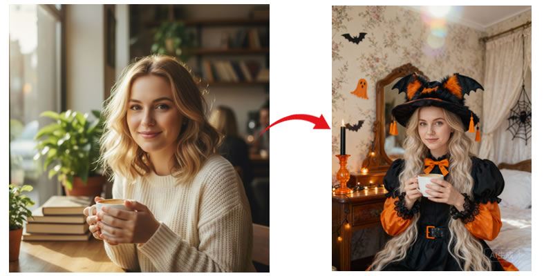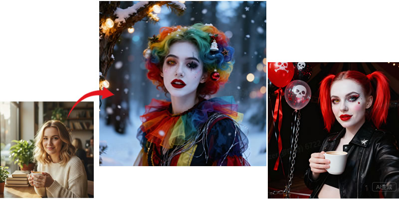 利用输入图像中女孩的真实面部、发型和面部特征比例,保持自然逼真。女孩置身于温馨的室内圣诞场景中,整幅画面是高质量的摄影棚肖像:背景中有燃着的壁炉、圣诞树、装饰品、烛光氛围灯、红绿主题的花环和堆叠的礼盒,整体空间呈现出温暖的金色光影色调。女孩盘腿坐在柔软的干草堆上,穿着复古的白色荷叶边打底衫 + 红色披风外套,袖口蓬松且有层次感; 她的双腿自然伸展在画面的前景中,穿着浅色的柔软袜子。姿势:女孩微微仰头,一只手自然抬起,另一只手撑在地上,任由飘落的雪花落在掌心,姿态温柔而放松;头发蓬松且微微卷曲,温暖的逆光勾勒出发丝的边缘,形成柔和的光线轮廓; 她的脸化着精致的妆容,画面柔焦,脸颊微微泛红。场景细节:前景中有一只毛绒泰迪熊、包装好的圣诞礼物和一个小雪人摆件; 背景中的圣诞树装饰着红色小球、铃铛和灯串,多个暖黄色小灯形成散景。灯光采用电影工作室的打光设置:主光柔和且颜色温暖,侧面和后方有轻微逆光以突出轮廓,雪花在画面中轻盈飘落,营造出梦幻的氛围。风格:写实人像 + 高品质圣诞主题工作室拍摄 + 轻电影暖光,构图完整,人物比例真实自然,氛围浓郁但不过度夸张。