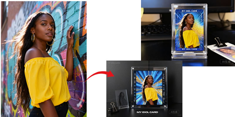 桌面采用黑色背景,营造出高端、稀有和限量版收藏的氛围。文字:顶部或底部可以有标题(如“我的偶像卡”),卡片配有小文字(日期或标语)。