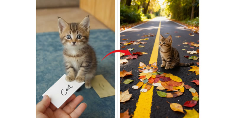提示词:帮我生成一张图片:图片中的宠物正坐在一条铺满彩色落叶的道路上,旁边是一件精心用各种树叶拼贴而成、形似其模样的宠物艺术品。道路宽阔,路面颜色较深,中间有黄色标线,两侧绿树环绕。阳光洒下,营造出自然、清新且富有创意的氛围。背景是一条铺满彩色落叶的道路。