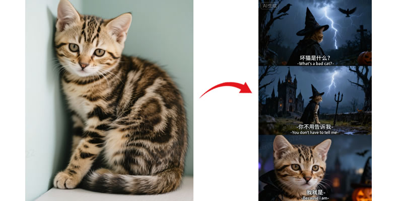 第三个是特写镜头。猫的脸位于屏幕左侧,背景是带有万圣节元素的场景。添加中英文字幕“因为我是 - ”