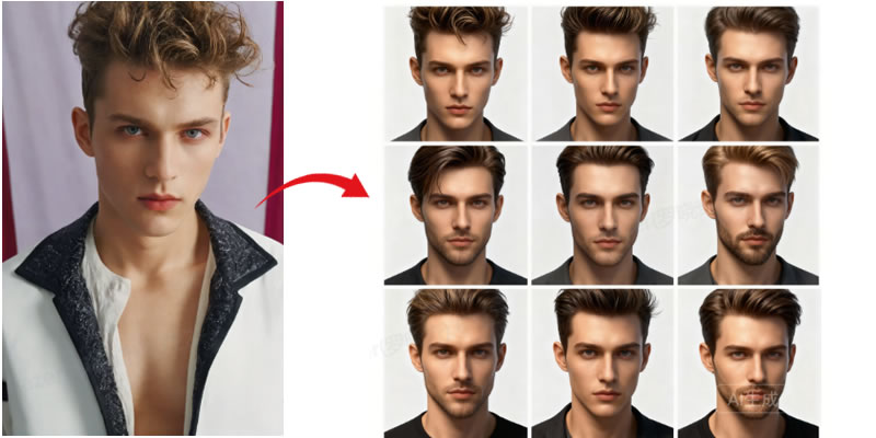 根据参考肖像图像,生成超写实的九宫格肖像图像,每个网格呈现不同发型,同时保留主体的原始面部特征、肤色和面部轮廓。背景统一为简单的浅灰色(以突出发型为主体),分辨率为8K,发丝细节清晰,光线均匀柔和(避免阴影遮挡发型)。