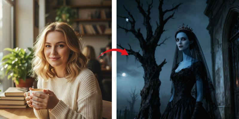 蒂姆·波顿风格,采用黑暗冷色调、诡异神秘的灯光,构图突出哥特式奇幻感。一位蓝皮肤的女子身着黑色婚纱、头戴面纱和王冠,在夜晚站在枯树和一座建筑旁。