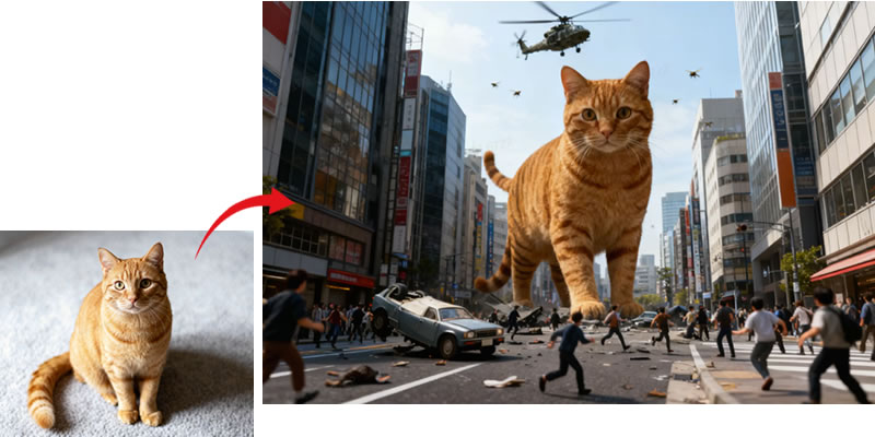参考图像中的一只巨型宠物站在像东京这样的现代大都市中。城市街道一片混乱,微型汽车翻倒在地,惊慌的人群四处逃窜。军用直升机在它上方盘旋,看起来就像小苍蝇一样。整个场景以超写实、电影般的风格呈现,采用戏剧性的低角度、广角镜头拍摄,以突出其宏大的规模。