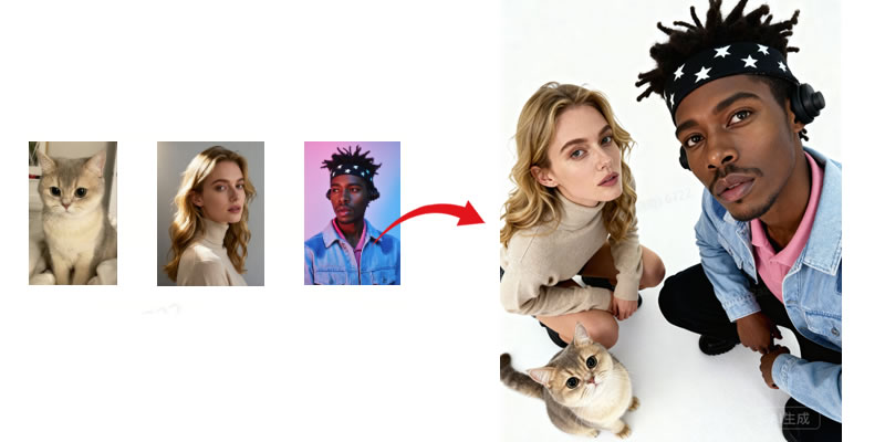 将第一和第二张输入图像融合成一张高角度俯拍的三人蹲地自拍照。构图紧凑,三位主体靠得很近,头部微微上扬,眼睛直视镜头。左边的人稍微靠前站,身体微微向内倾斜。拍摄角度为高角度俯拍,头部比例稍有夸张放大,符合日韩视觉自拍风格。背景为纯白色,简洁干净,突出人物主体。图像风格偏向日系视觉风格,清晰度高,模拟iPhone前置自拍效果。人物与画面无缝融合,视觉过渡自然,光线明亮均匀。