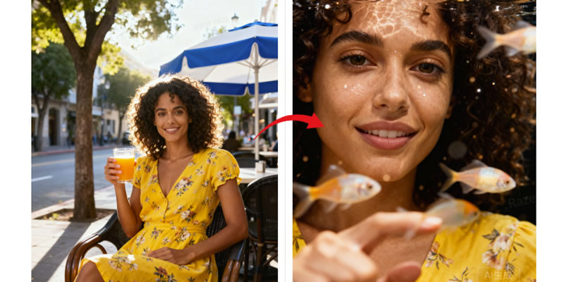 水下时尚人像,保持原图像主体不变,采用极近距离的特写面部构图拍摄。主体的眼睛直视镜头,表情自然放松,面部高光处浮动着细腻的微光,清晰呈现出皮肤与水下光影之间的互动质感。前景中,几条迷你热带鱼缓缓游过,它们透明灵动的鱼鳍轻轻拂过画面; 主体伸出一根手指,轻柔地与鱼互动,动作自然不做作。