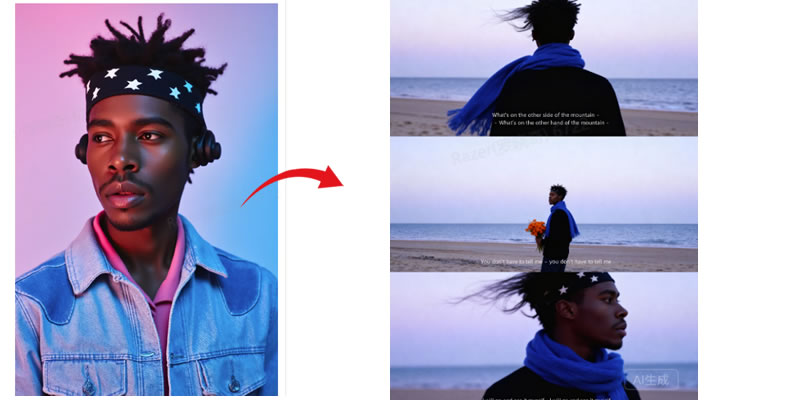 一张三格的电影质感艺术人像照片。在同一张照片中,场景是海边沙滩,天空呈现出从浅紫色到灰色的渐变,海面平静。画面中的人物与参考图像一致,穿着黑色上衣,搭配蓝色围巾。第一张照片是特写,人物居中,展现站在沙滩上的背影,头发被风吹起,并添加英文字幕 “What's on the other side of the mountain - What's on the other hand of the mountain”; 第二张照片中,人物手持橙色花束,位于画面中心,侧身站在海边,配有英文字幕“You don't have to tell me - you don't have to tell me”; 第三张照片是特写,人物居中,脸部稍微偏向画面右侧,头发随风飘动,并添加英文字幕 “I will go and see it myself - I will go and see it myself”。整体色调偏冷,营造出一种文艺且自我探索的情感氛围。