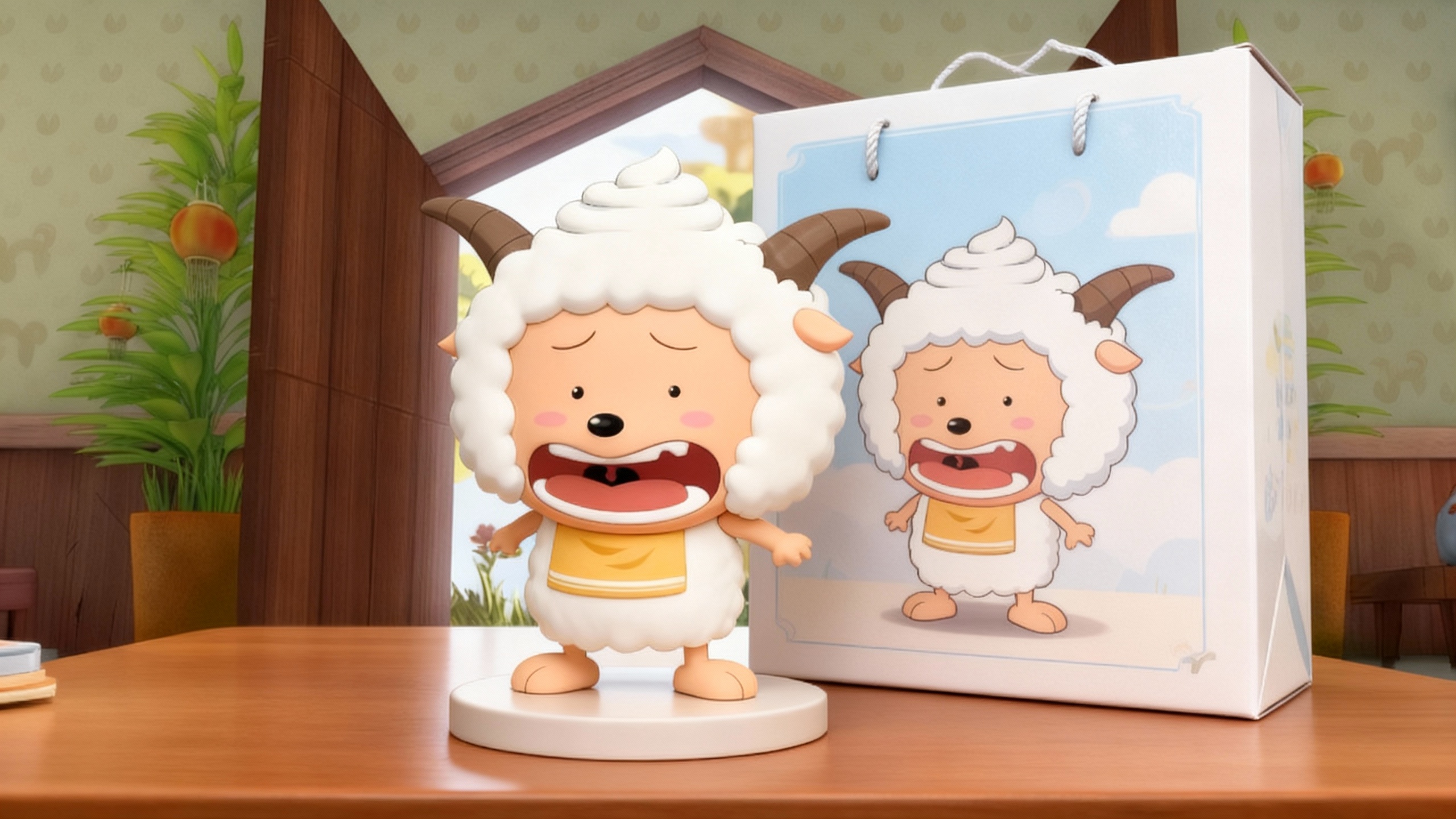 参考图中的人物形象制作手办,放在桌上,后面有印有角色图像的礼品盒, 手办站在圆形底座上,场景室内,风格与原图一致