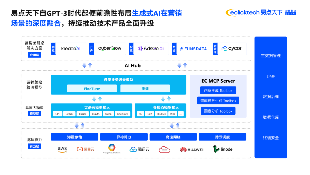 易点天下自GPT-3时代起便前瞻性布局生成式AI技术在营销场景的深度融合,持续推动从底层技术能力到系统化产品架构的全面升级。全新一代数智营销解决方案——AI Drive 2.0以自研的MCP Server智能中枢为核心调度平台,整合创意素材生成、智能投放管理、产品洞察分析三大Toolbox,并通过数眼智能、KreadoAI、CyberGrow、AdsGo、Cycor、易鲸灵等核心产品矩阵,汇聚海量AI Agent能力,可实现智能洞察-创意生成-自动投放-数据归因的全链路营销AI自动化闭环,为深陷“增长焦虑”的全球企业提供破局新解法。
