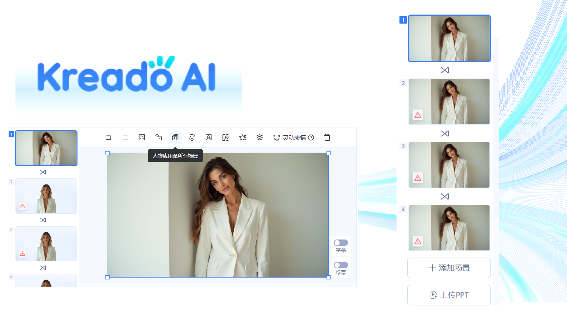 在视频制作过程中,调整每一帧的元素可能会耗费大量时间,尤其是在需要统一风格时。为此,我们推出“一键应用至所有场景”功能,帮助用户快速将已调整好的图片、人物、文字元素应用到整个视频中。