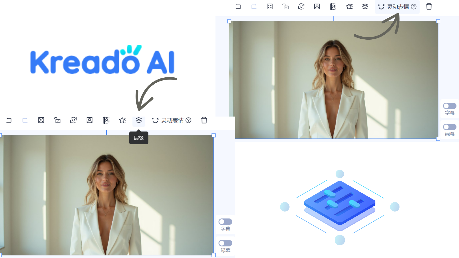 KreadoAI 推出五大工具,让视频创作更高效:灵动表情提升数字人表现力,一键抠图精准去背景,素材动效增强视觉流畅度,图层调整优化画面层次,一键应用提高制作效率。