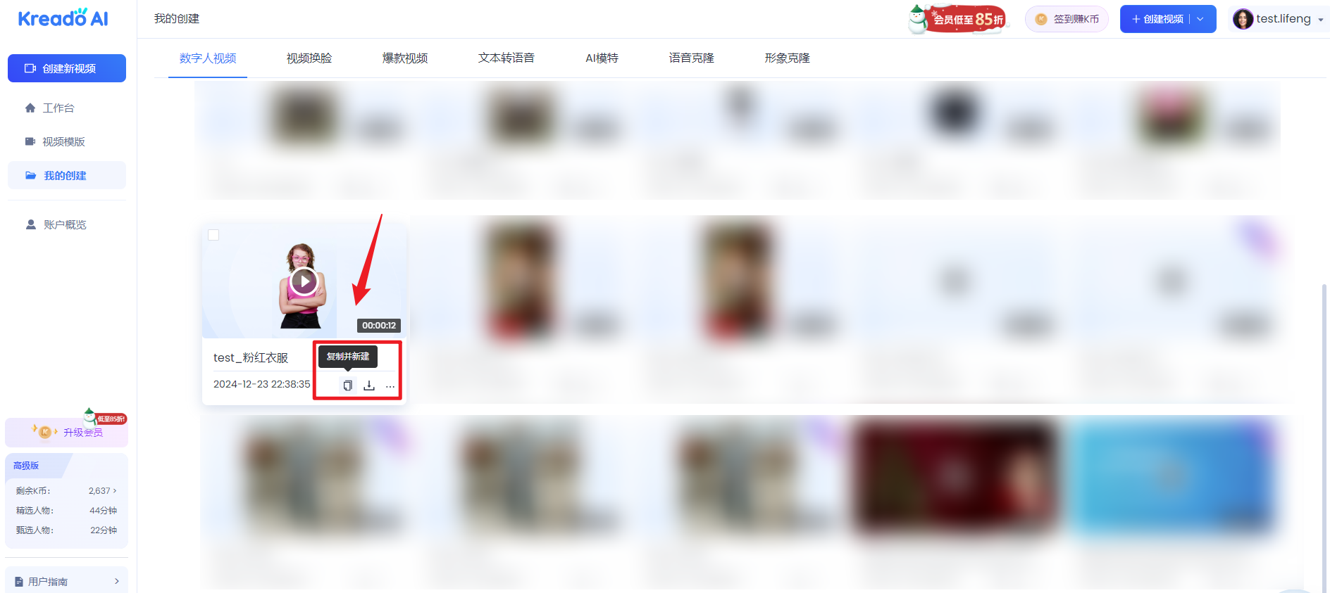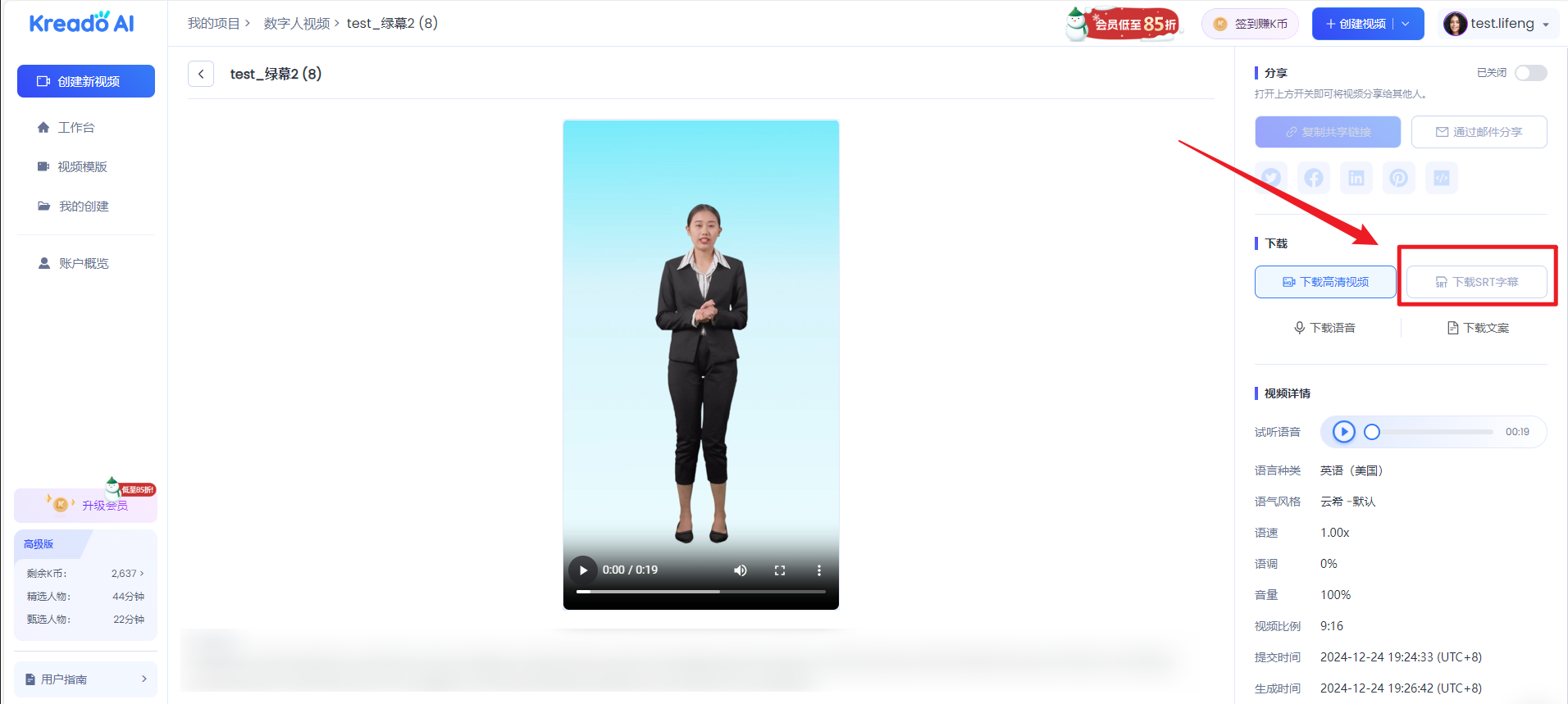 访问 “我的创建”,点击进入视频详情页,右侧点击“下载SRT字幕”。