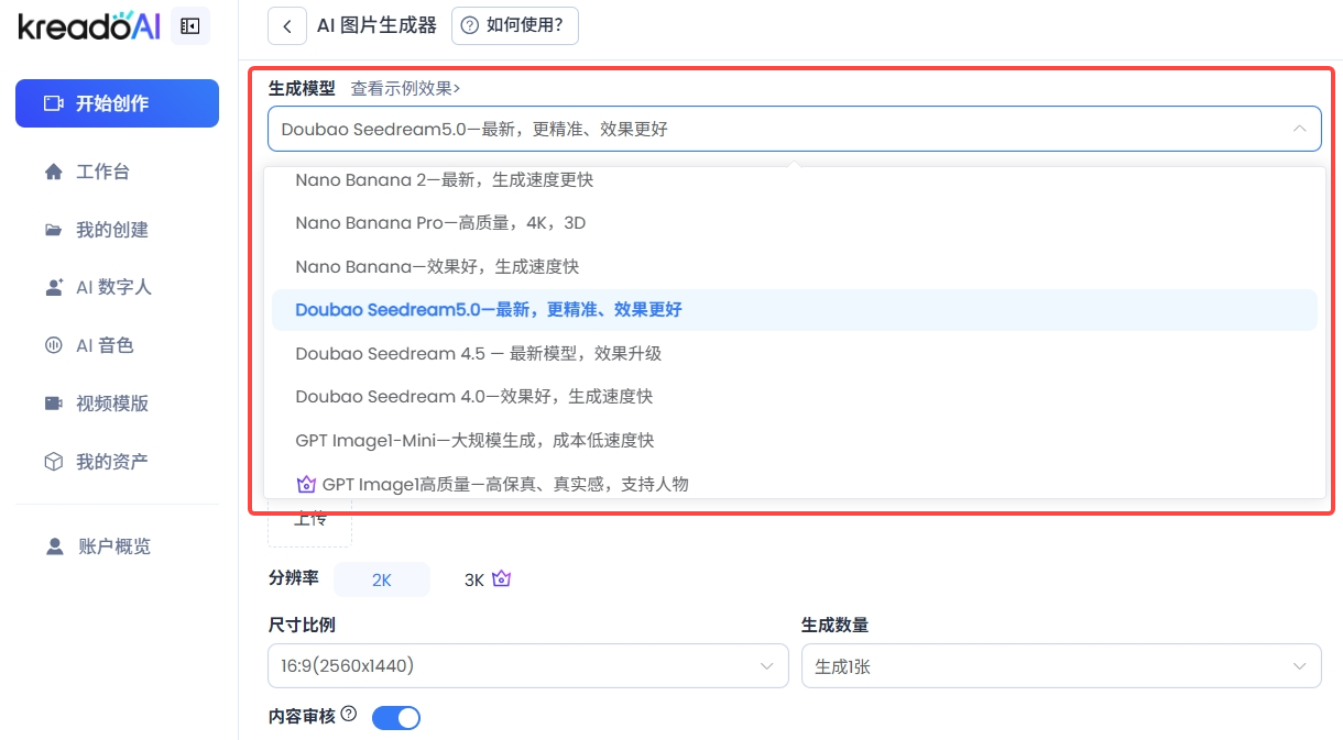 打开 KreadoAI 平台,进入 AI生成图片 功能模块。在模型选择栏中找到你需要使用的生成模型(推荐最新接入的 Nano Banana 2、Doubao Seedream 5.0 模型),点击即可选中并切换模型。