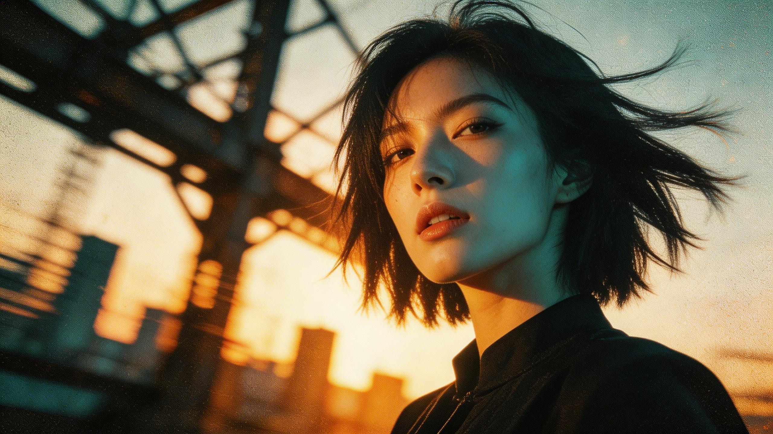 ✅ 正确示例:生成一张电影级胶片风格人物肖像,前卫青橙对比与黑金元素碰撞,HDR光影,主体锐利突出,背景动态模糊浅景深;人物为不羁女性,凌乱短发随风,超低角度或倾斜构图;抽象都市/工业场景,日落余晖形成剪影与光晕,高光略过曝,运动模糊增强动态感,胶片颗粒清晰,细节锐利,无多余元素。